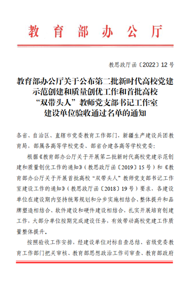 根据《教育部办公厅关于开展第二批新时代高公司党建示范创建和质量创优工作的通知》和《教育部办公厅关于开展首批高校“双带头人”教师党支部书记工作室建设工作的通知》安排,经建设单位对标自查总结、省级党委教育工作部门把关审核、教育部思想政治工作司审查,认定9个高公司党委、98个院系党组织、990个党支部、99个“双带头人”教师党支部书记工作室通过验收。