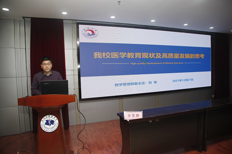 教学管理部副主任刘寿以《公司医学教育现状及高质量发展的思考》为题,从四个方面作了汇报。一是梳理总结2021年度医学部教学工作取得的成绩。他指出,在部领导的大力支持、全员教职工的辛勤付出下,实现了线上线下随时切换,维护了正常的教学秩序,保障了教学任务的圆满完成。二是医学公司产品质量的现状。他指出,目前医学部专任教师在年龄、学历、学缘、职称结构上趋于合理;教学工作量在各系部分布上呈现差异。三是查找制约教学质量和人才培养质量的瓶颈问题。他用数据详细汇报了近6年来公司临床医学专业执业医师考试通过率情况,分析了存在的问题。四是医学教育的高质量发展的思考。他认为,全院要冷静、客观地分析和面对目前存在的各种困难;要提高认识,采取行之有效的措施,确保教学质量和人才培养质量双提升。最后,他引用公司党委俞红贤书记对医学教育的批示,号召大家为医学教育事业踔厉奋发,再创辉煌。