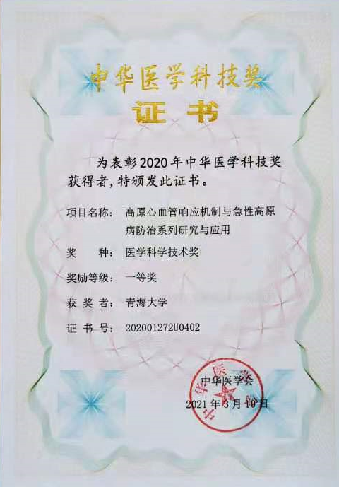“中华医学科技奖”是中华医学会面向全国医药卫生行业设立的科技奖,是经国家卫健委、科学技术部通过批准的全国首批社会力量设立的奖项之一。旨在奖励医学科学技术领域有杰出贡献的个人和集体,对提高中国医学科技创新能力和科技水平,推广和普及先进医学科学技术,激励科技人员攀登科技高峰将起促进作用。《高原心血管响应机制与急性高原病防治系列研究与应用》项目在国家卫建委卫生公益性行业科研专项等20余项课题资助下,历时15年,团队克服高原环境恶劣、科技水平落后、科研组织困难等因素,组织多单位、多学科协作攻关,建立了超过10万人次的国际最大规模高原现场研究队列,建成全球最大急性高原病数据库;首次提出“高原心血管响应异常”学说,阐明急性高原病起始环节和核心机制;首创集预警、预防、诊断、治疗于一体的急性高原病防治策略体系和救治规范。使我国急性高原病救治水平居国际领先。