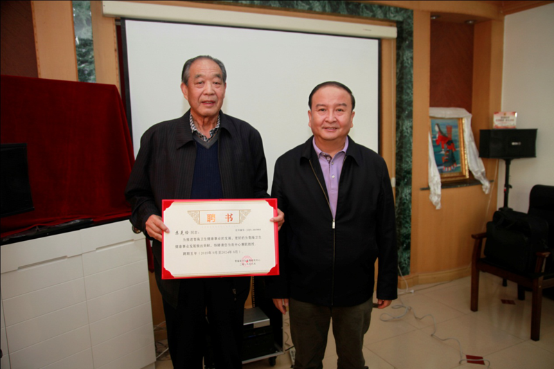 卫生发展研究中心主任刘永年教授向中心顾问、副主任颁发聘书、徽章;各位副主任向兼职教授及研究人员颁发聘书、徽章。