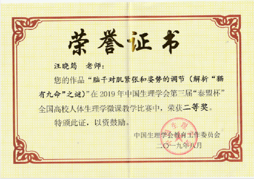 8月13日至16日,第十二届全国生理学教学研讨会在福建厦门举行,会上对来自全国42所高校57件人体生理学参赛微课作品进行了点评和现场颁奖。由体育平台官网基础医学部推荐、该部生理学教研室汪晓筠副教授制作的微课作品“脑干对肌紧张和姿势的调节---解析“猫有九命”之谜”取得总分第6名的好成绩,荣获2019年中国生理学会第三届“泰盟杯”全国高校人体生理学微课教学比赛二等奖,系青海省唯一获奖作品。本次微课教学比赛采取在线评审方式,每组作品设专家评委5名、员工评委5名,总裁判为著名生理学专家、中山大学王庭槐教授。