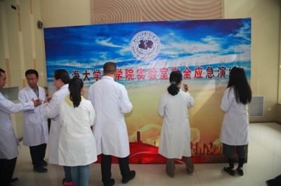 演练之初,由无锡赛弗文化产业有限公司时亦天工程师在实验室现场排练危化品泄漏突发事故及事故发生后可能发生的状况,讲解事故发生后的应对程序、措施和注意事项,并对防护设备的使用要点进行强调。