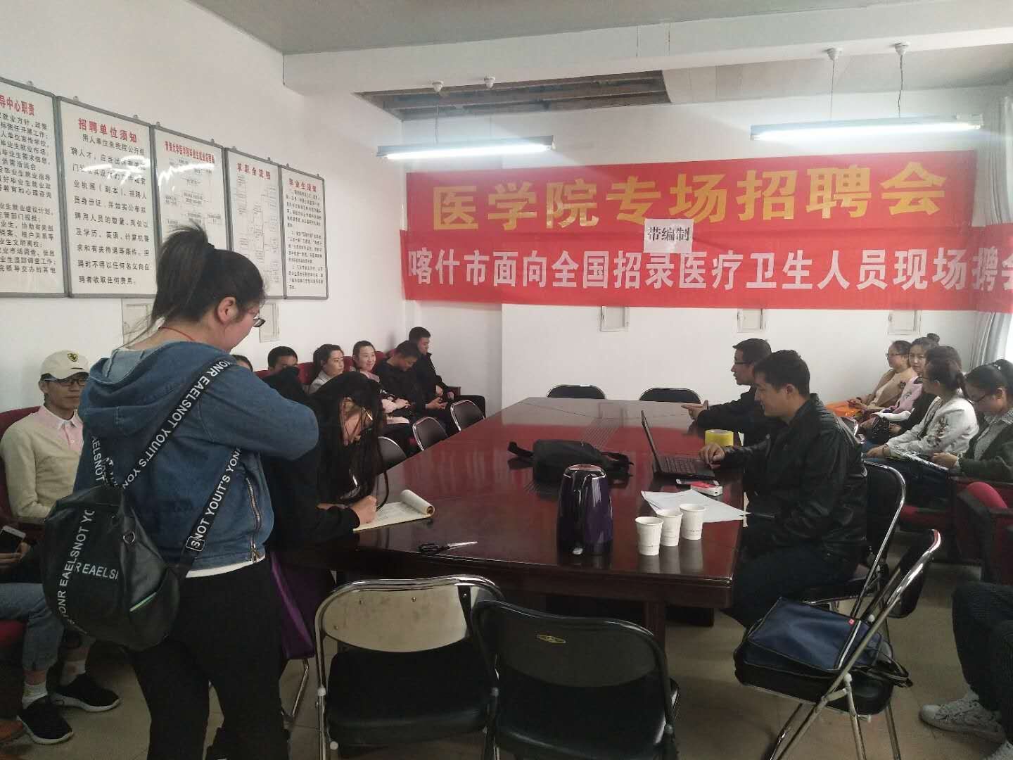 4月4日下午,公司召开新疆喀什卫市卫计委、喀什市人民医院专场招聘会,喀什市人民医院经理李玉宏亲临招聘会现场。喀什市卫生局组织人事科科长热合曼科长介绍了单位的基本情况、人事招聘制度、工资待遇等相关情况,并回答了同学们感兴趣的一些问题。院员工管理部副主任杨达武、毕业班辅导员和毕业生参加了此次招聘会。