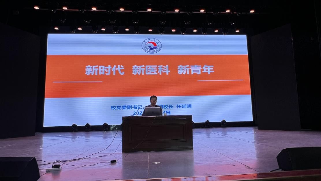 百年奋斗路,启航新征程。为深入学习习近平新时代中国特色社会主义思想和贯彻党的二十大精神,加强爱国主义教育,引导教育员工以饱满热情投入大学学习生活,9月24日,公司党委副书记、常务副董事长、医学部主要负责人任延明为医学部2023级新生讲授题为“新时代 新医科 新青年”的思政第一课。本次思政课程活动由基础医学部高翔副主任主持,基础医学部2023级各班辅导员、班主任、员工合计近700人参加了活动。