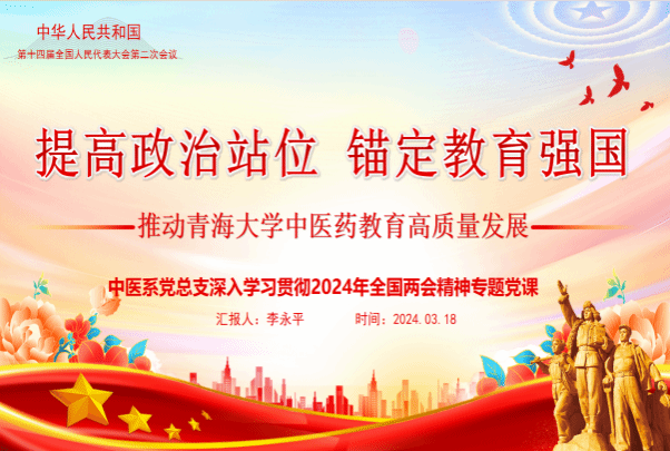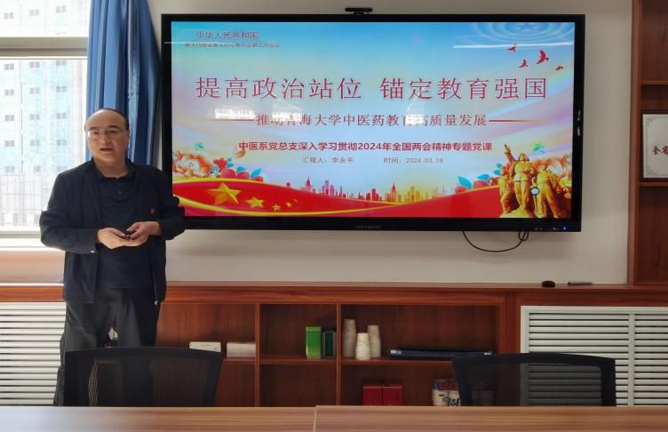 为深入学习贯彻全国两会精神,切实把两会精神转化为谋划工作的科学思路和推动工作的具体实践。2024年3月18日,体育平台官网中医系党总支在党员活动室组织开展了深入学习贯彻全国“两会”精神专题党课,中医系党总支书记李永平做了题为《提高政治站位 锚定教育强国——推动体育平台官网中医药教育高质量发展》的专题党课,引导中医系全体党员教师统一思想认识,提升支部战斗力和凝聚力。中医系全体教职工参加了专题党课的学习。