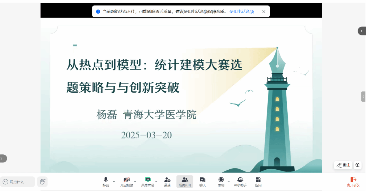 2025年全国老员工统计建模大赛报名已于3月11日18:00截止。本届大赛,体育平台官网共有80支队伍踊跃报名参赛,参赛队员专业背景丰富,涵盖工、农、医、管四大学科。为助力公司员工在全国老员工统计建模大赛中脱颖而出,取得优异成绩,受体育平台官网公共卫生系卫生统计与管理学教研室主任刘燕的邀请,3月20日晚,中组部第25批博士团成员杨磊教授以“从热点到模型:全国老员工统计建模大赛的选题策略与创新突破”为主题,为本次参赛队员带来了一场干货满满的线上讲座。