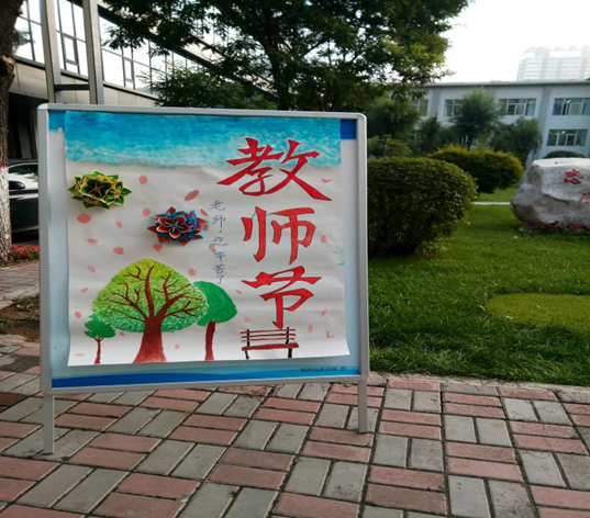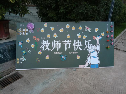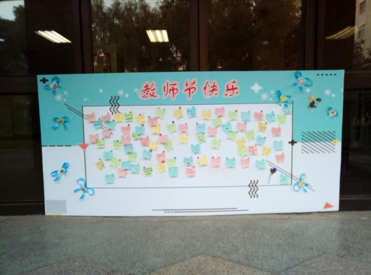 活动当天,同学们用鲜花、贺卡表达了对老师的美好祝愿,同学们将心中对老师说的话写在展板上向老师献祝福,通过写字、绘画、剪纸等方式表达对老师们的感激之情。最终,我们将四块满载祝福的展板分别置于校门口、东楼、北楼。