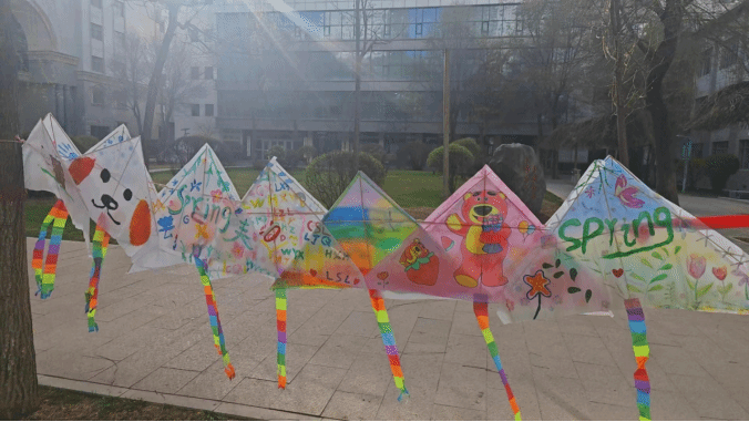 4月8日我们收集同学们的风筝并将它们在昆仑路医学部校内的走道旁集中展示,为校园增添了别致的春天气息。