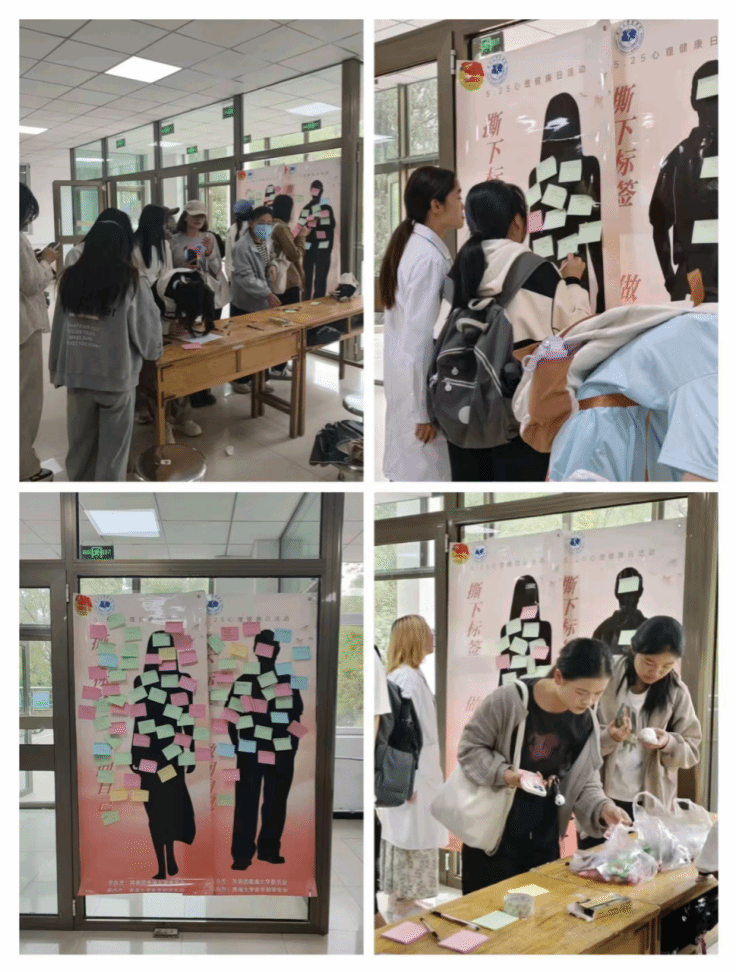 活动在两个校区同步开展:昆仑路校区举办了名为“头脑特工”的活动,通过有趣的《头脑特工队》角色,让员工们在轻松愉快的氛围中提升自我认知与情绪管理能力;而在基础医学部,则开展了“撕掉标签,拒绝焦虑”主题活动,鼓励员工正视并克服内心的焦虑与不安,积极塑造健康的心理状态。活动中特别设置的情绪展板部分也备受瞩目。同学们纷纷将自己的烦恼与愿望写在便签上,贴在展板上,同时也写下鼓励与安慰的话语,放入旁边的情绪盲盒中。这一环节不仅为员工们提供了一个情绪宣泄的出口,也让他们感受到了来自同伴的温暖与支持。