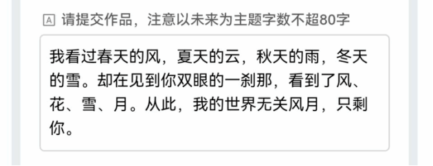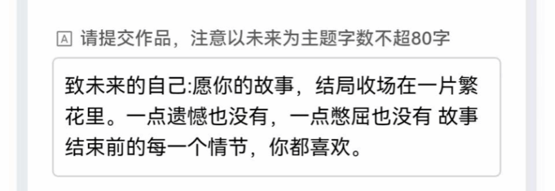 希望通过本次活动,可以让同学们大胆的通过这种方式表达自己的独特思考和真挚情感,激发同学们的创造力和表达能力,也能够让同学们深入思考未来的前景和对未来美好生活的向往。希望在奔赴未来的路上,我们都能有着生生不息的热爱,如星璀璨,如风自由。