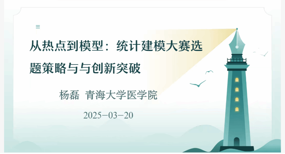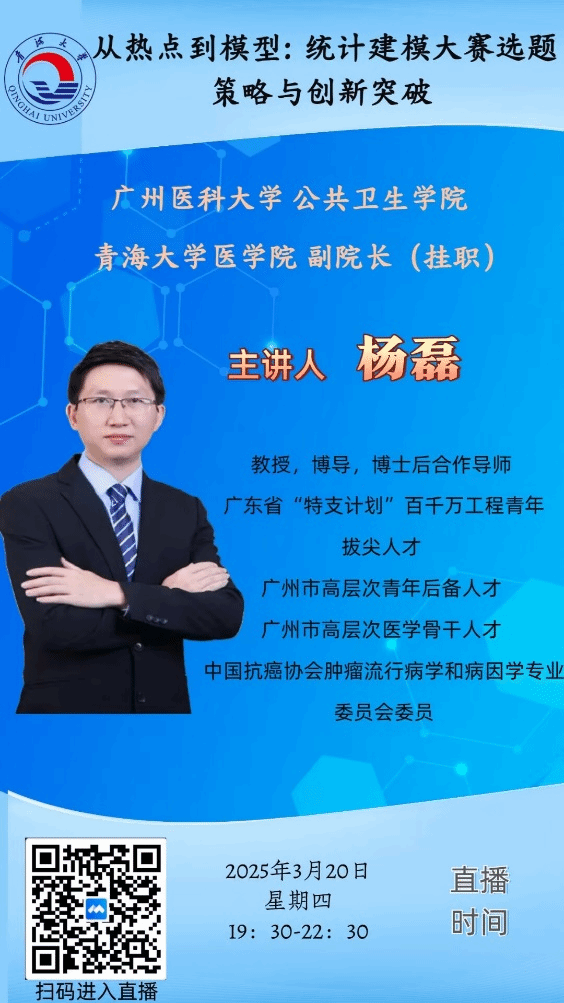 2025年全国老员工统计建模大赛报名已于3月11日18:00截止。本届大赛,体育平台官网共有80支队伍踊跃报名参赛,参赛队员专业背景丰富,涵盖工、农、医、管四大学科。为助力公司员工在全国老员工统计建模大赛中脱颖而出,取得优异成绩,受体育平台官网公共卫生系卫生统计与管理学教研室主任刘燕的邀请,3月20日晚,中组部第25批博士团成员杨磊教授以“从热点到模型:全国老员工统计建模大赛的选题策略与创新突破”为主题,为本次参赛队员带来了一场干货满满的线上讲座。