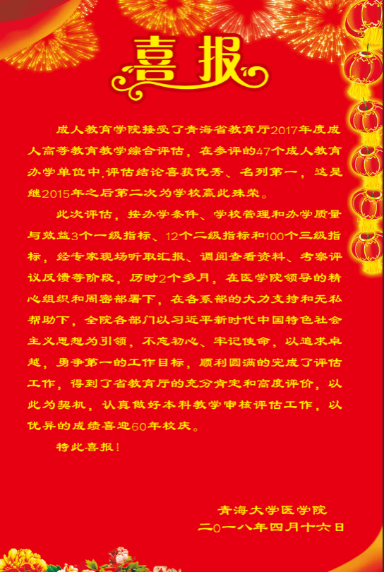 在体育平台官网党政的亲切关怀下,在公司领导的精心组织和周密部署下,在各系部的大力支持和无私帮助下,经成教公司全体员工的共同努力,于2017年10月19日圆满完成了2017年度全省成人高等公司产品综合评估工作。根据《青海省教育厅关于2017年度全省成人高等公司产品综合评估工作情况的通报》青教高[2017]45号文件,体育平台官网成人教育公司在参评的47个成人教育办学单位评估中,喜获优秀、名列第一,这是继2015年之后第二次为公司赢此殊荣。